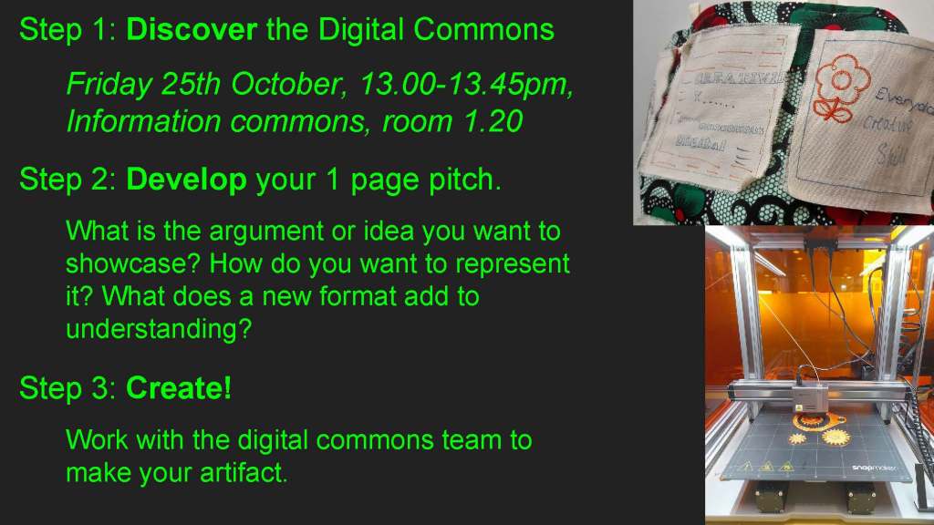 Students are invited to pitch their ideas for creative projects – what idea they seek to represent, and what they envisage making. They will then have the opportunity to work with the team from the Digital Commons to use the tools and resources to make their creative project.